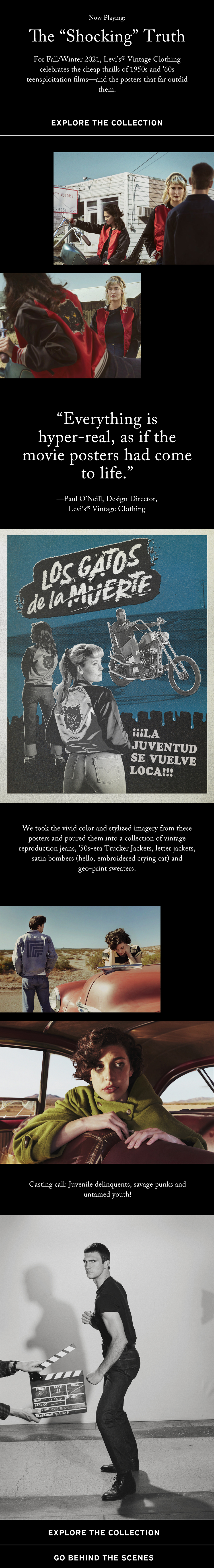 For Fall/Winter 2021, Levi’s® Vintage Clothing celebrates the cheap thrills of 1950s and ’60s teensploitation films—now cult classics of Hollywood Cinema. Levi's Internal team tapped TH team to bring their vivid color poster designs and mid-century inspired photography to life on the digital consumer front for the following distribution channels: social, app, .com and in store.